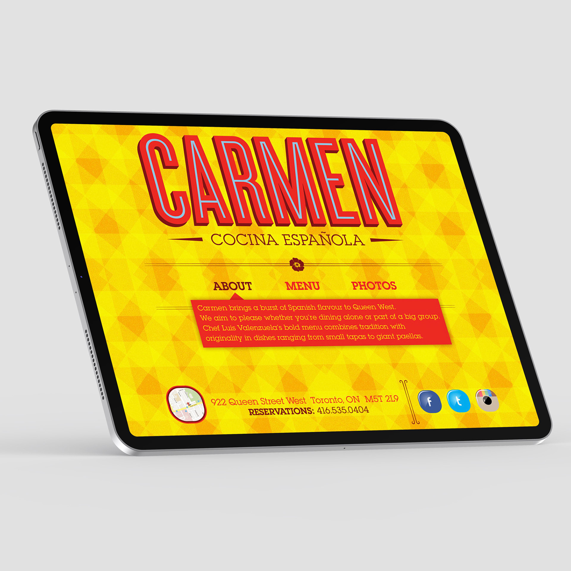 Visual Identity (logo, business cards, signage, menus, website, etc.) for Carmen Restaurant in Toronto.
